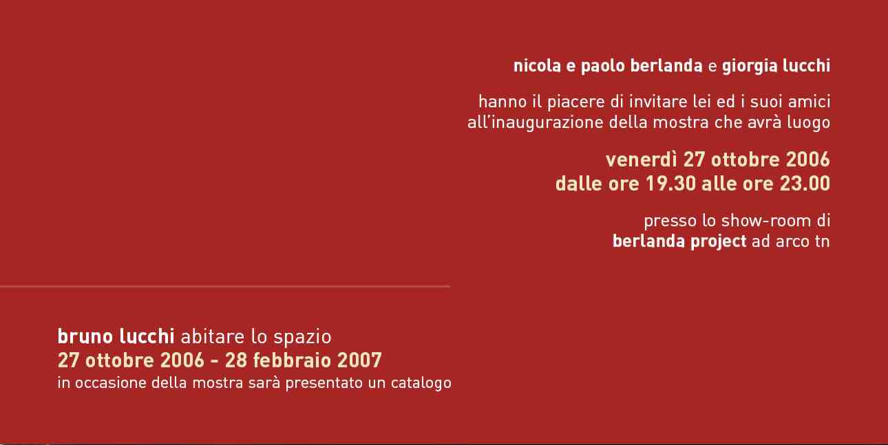 Venerdì 27 ottobre 2006 si è inaugurata nel prestigioso showroom Berlanda Project di Arco la mostra personale dello scultore Bruno Lucchi dal titolo “Abitare lo spazio”.