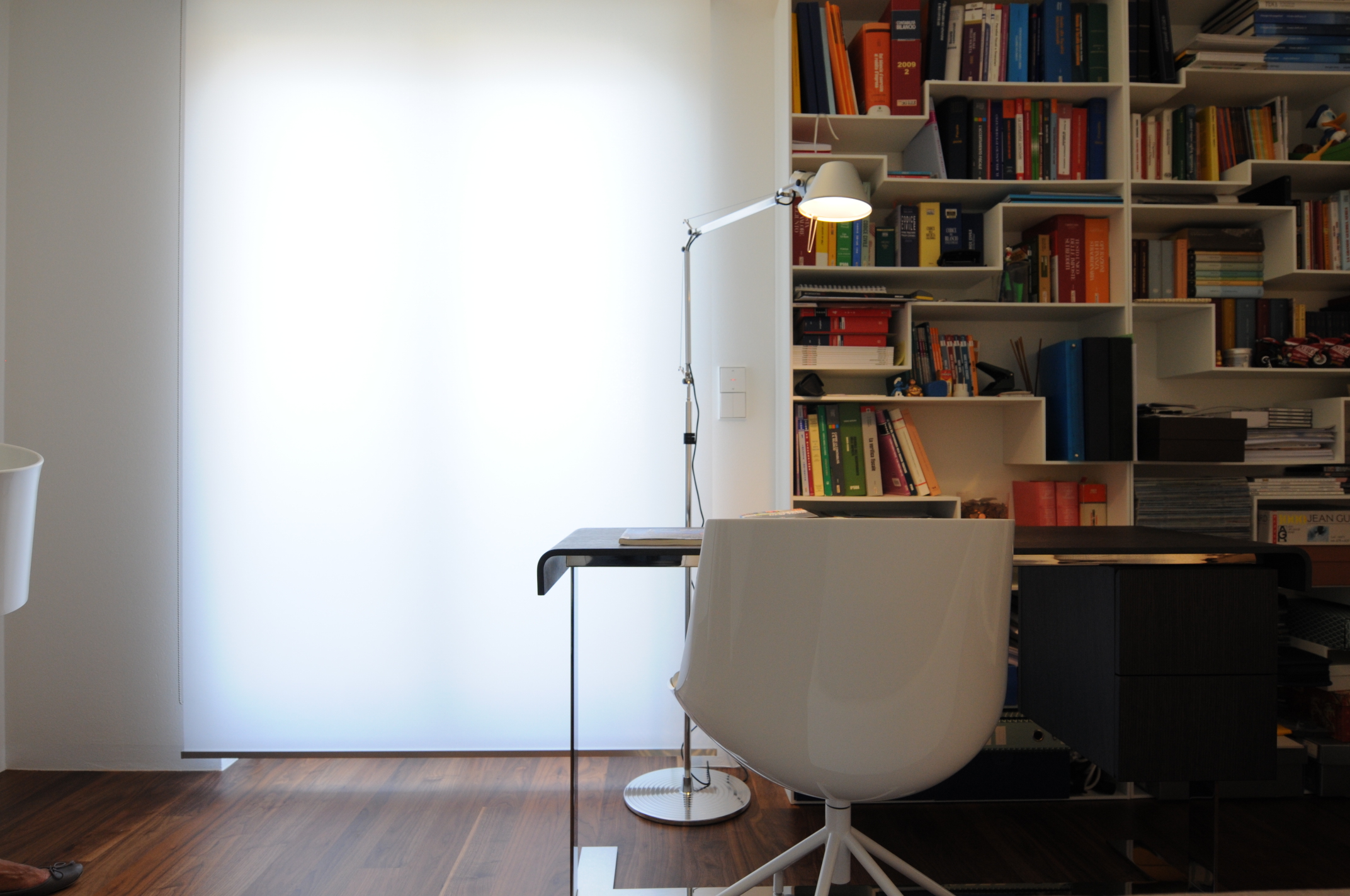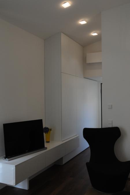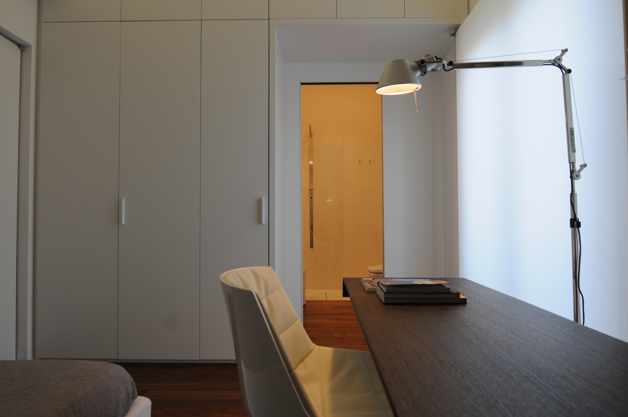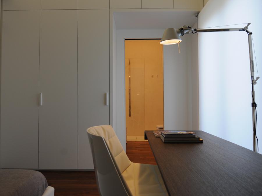 Contenere senza appesantire, con armadiature che si integrano nelle pareti; ripulire da tutti gli orpelli non necessari con porte rasomuro, battiscopa a scomparsa, tende a rullo per mascherare i fori finestra.