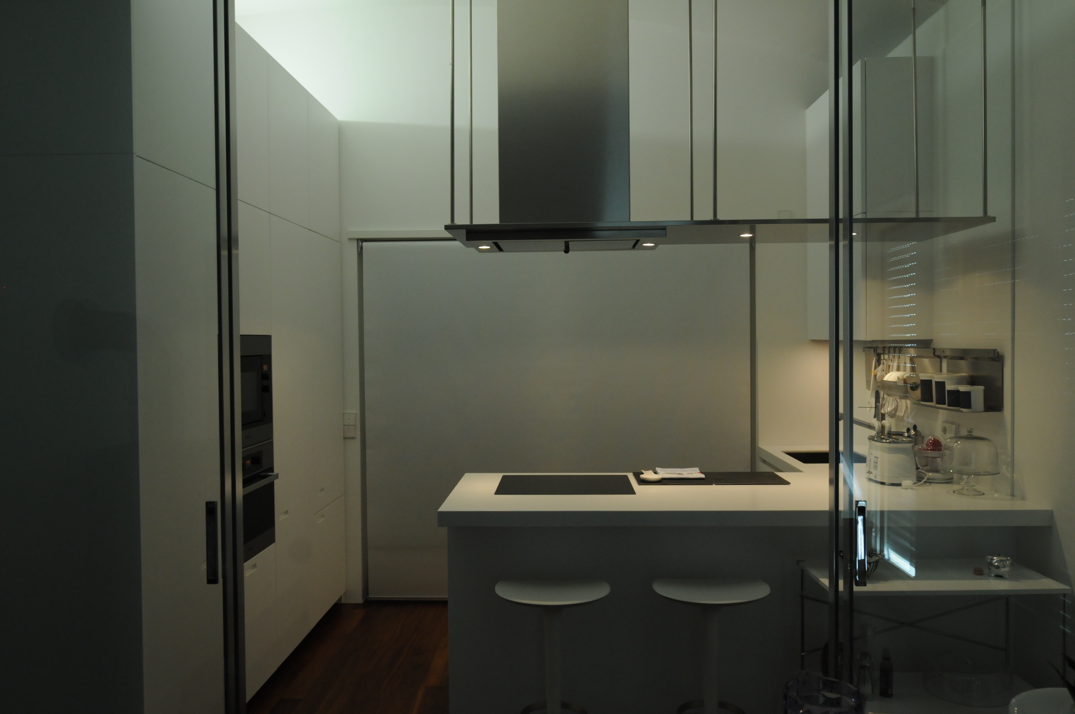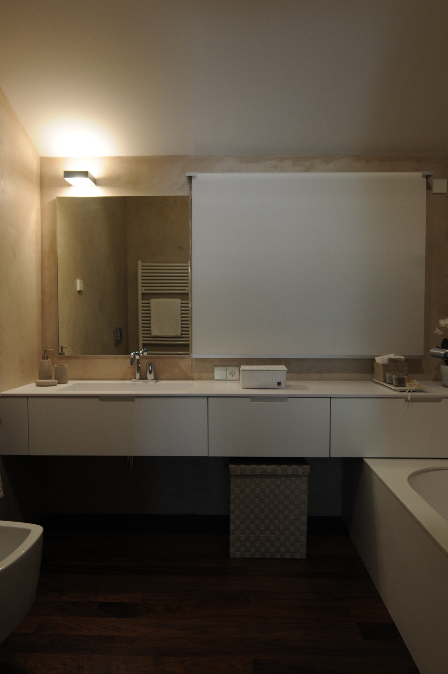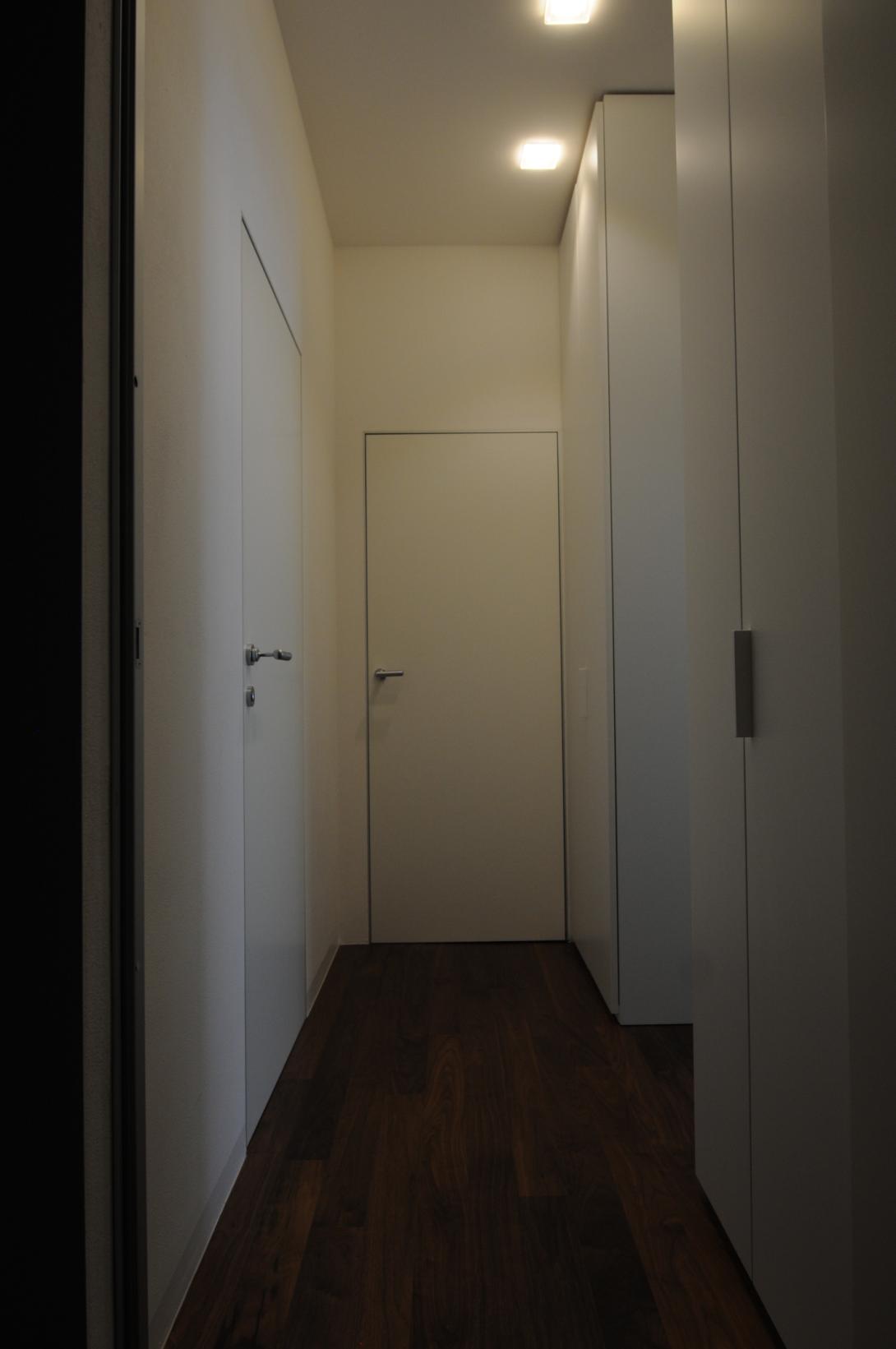 Contenere senza appesantire, con armadiature che si integrano nelle pareti; ripulire da tutti gli orpelli non necessari con porte rasomuro, battiscopa a scomparsa, tende a rullo per mascherare i fori finestra.