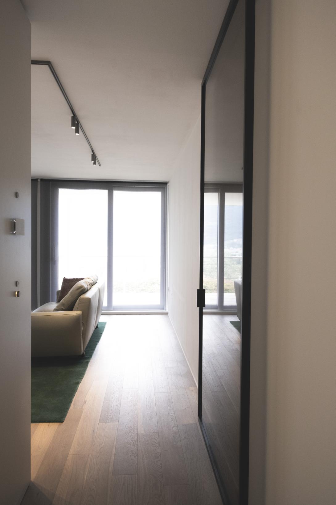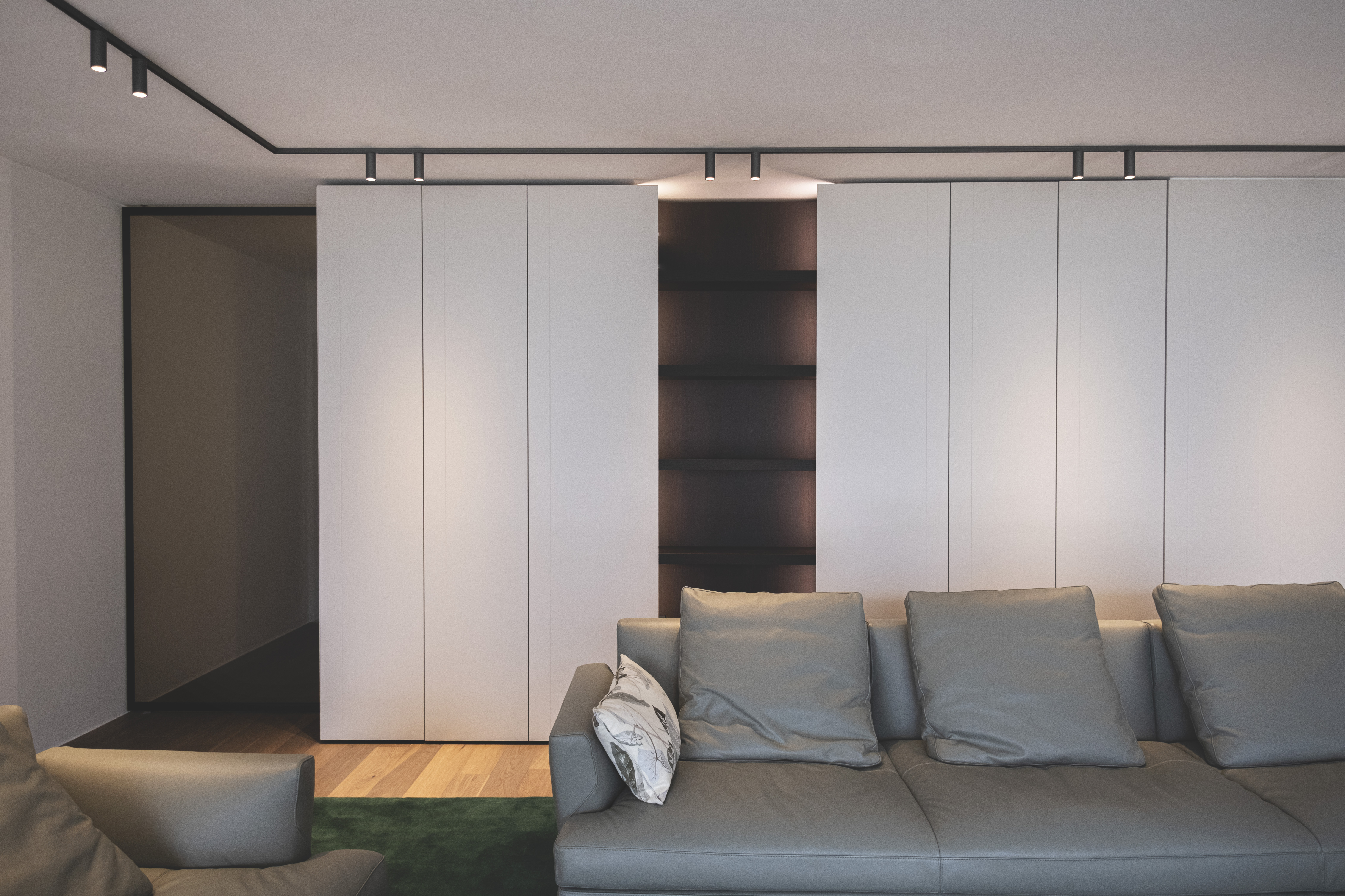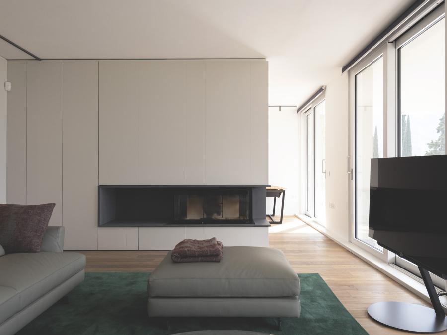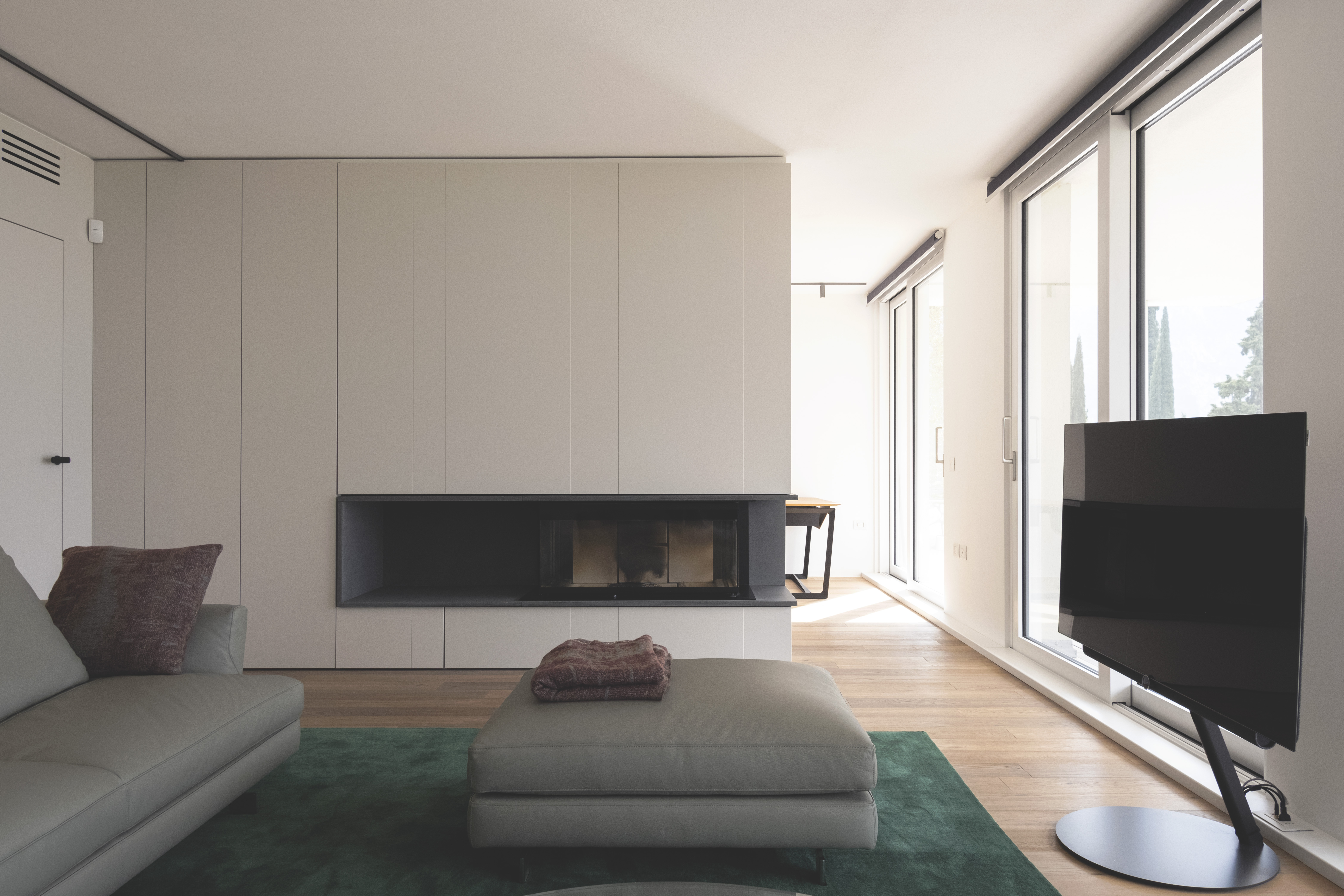 Pannellature usate come una pellicola per nascondere pieni e vuoti, impianti, elementi tecnici, passaggi, necessità di contenere; tutti gli sguardi sono così liberi di oltrepassare la vetrata per godere del verde e dell'azzurro del lago.