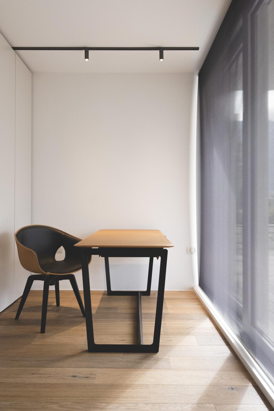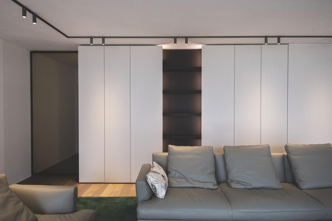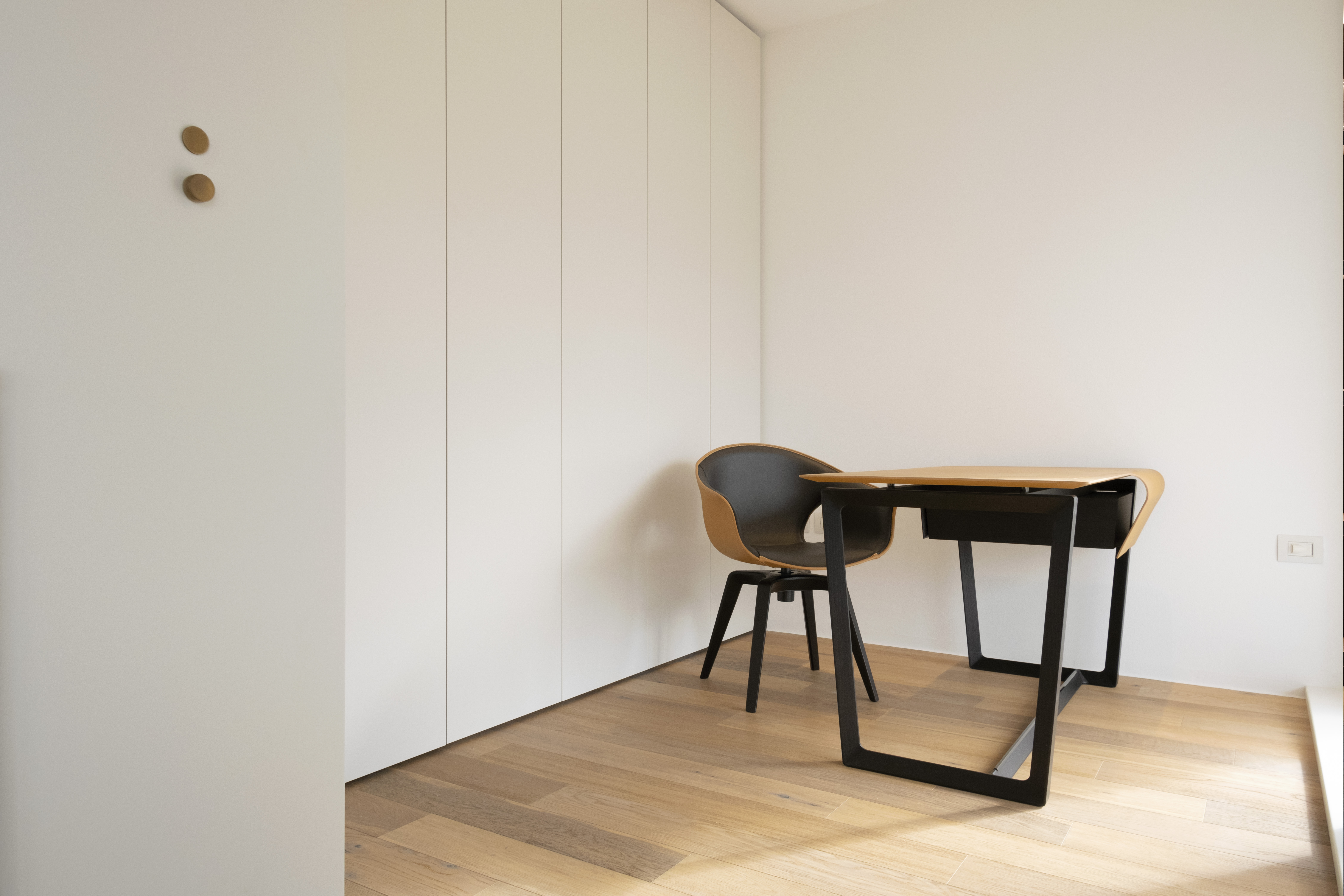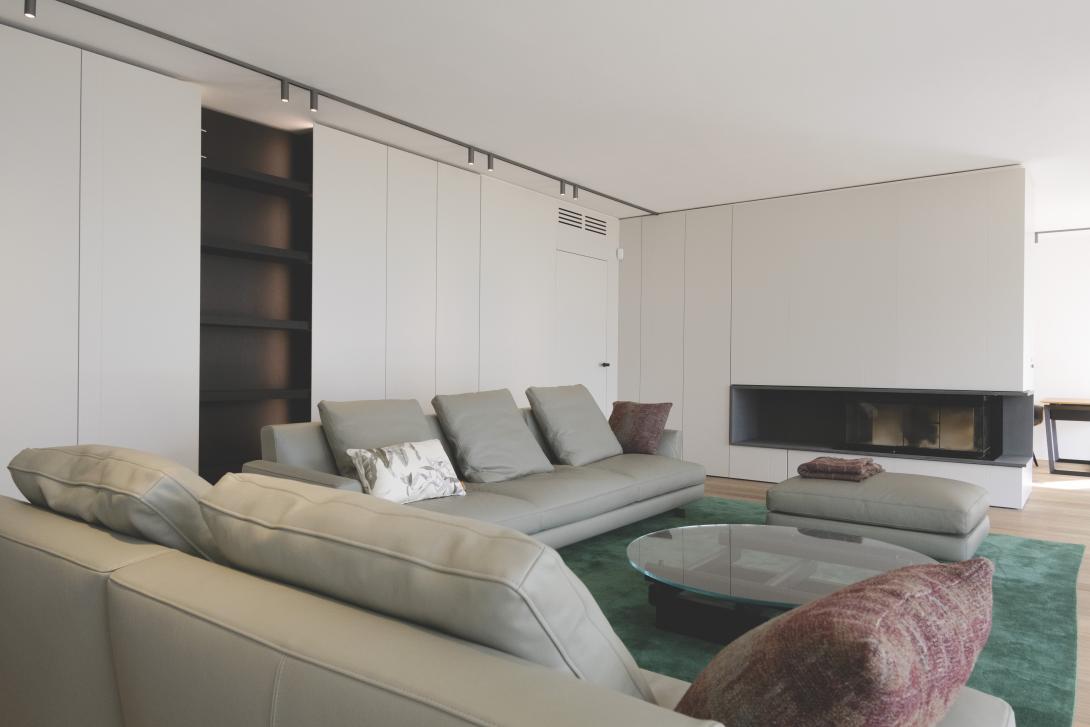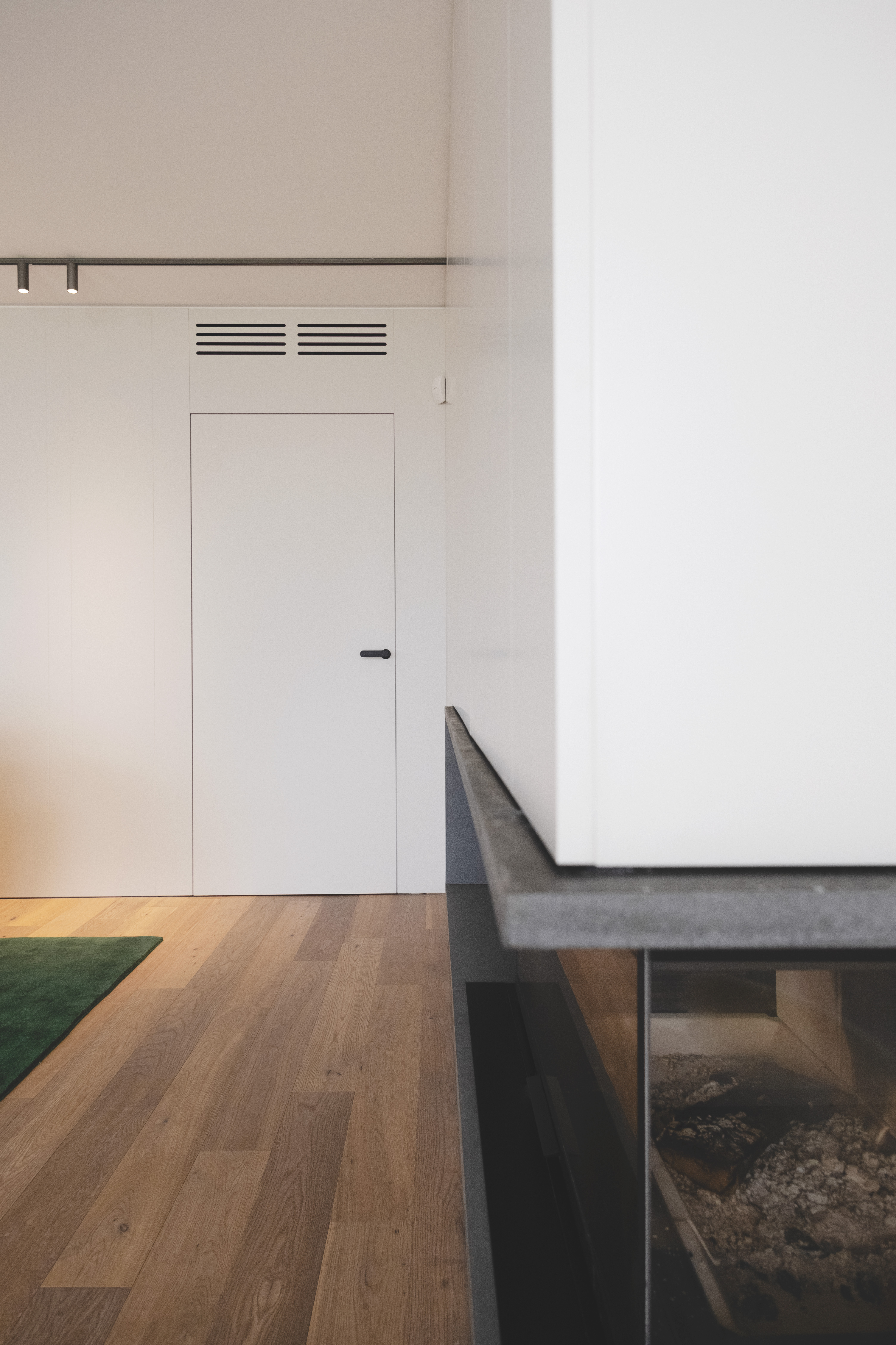 Un progetto di interni orientato alla ricerca della semplicità formale, dove è stata posta grande attenzione nel "ripulire" per lasciar parlare la luce, studiata per creare l'atmosfera serale insieme alla fiamma del camino a legna, il colore usato nell'isola di soggiorno centrale, la convivialità separata ma non isolata dal piccolo studio dietro alla parete del camino.