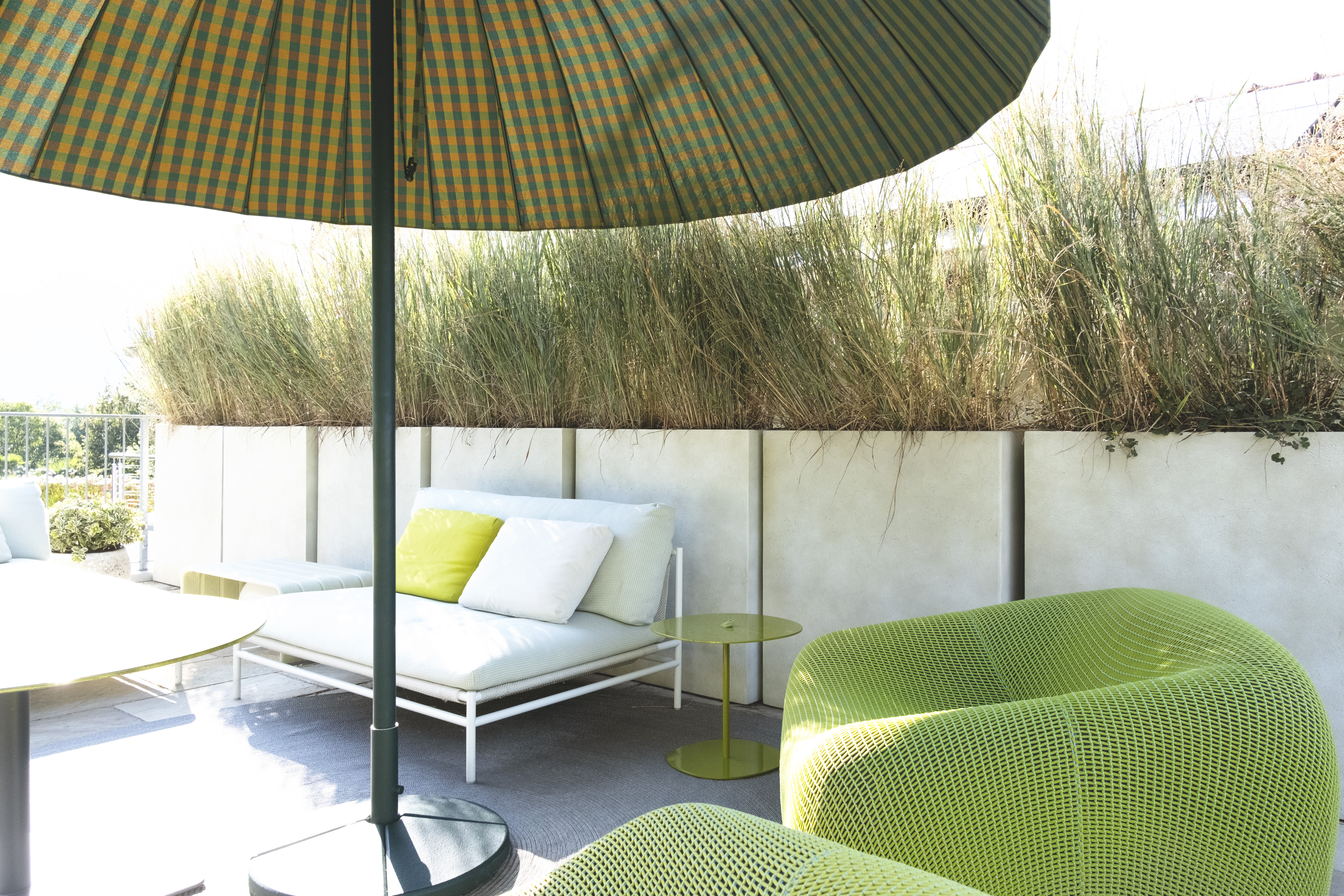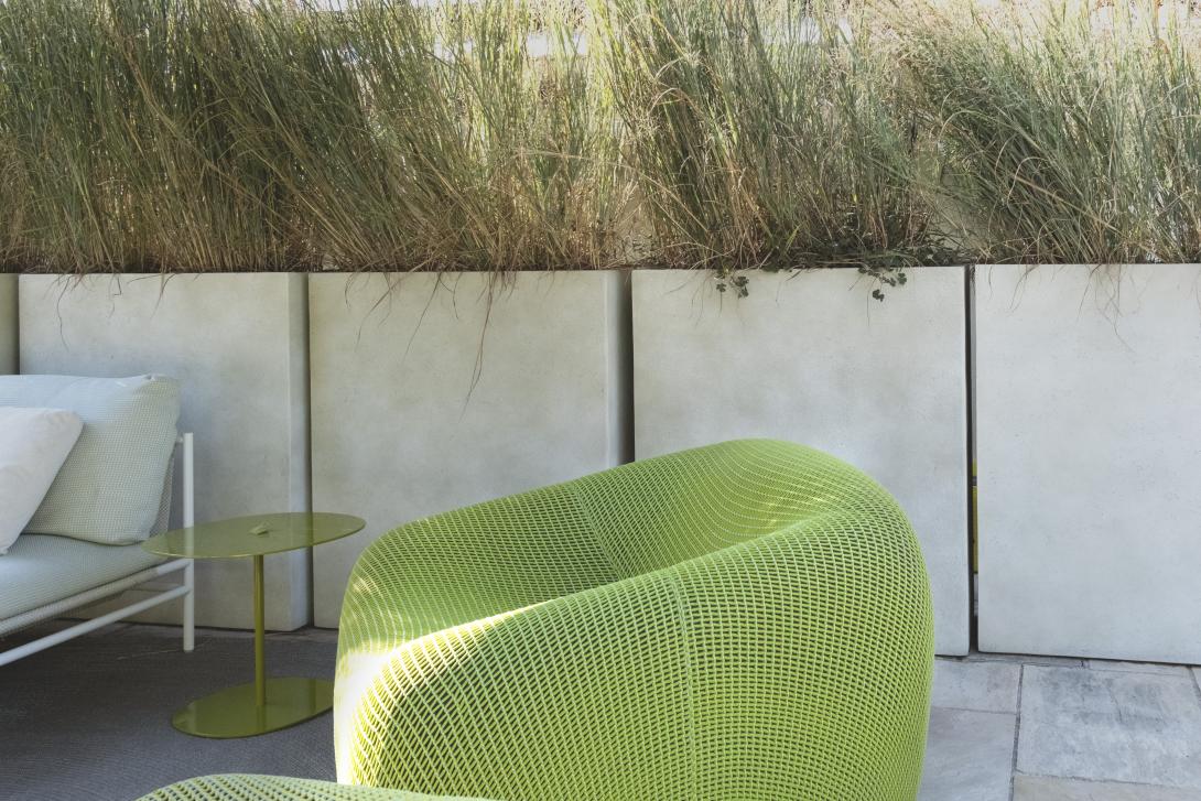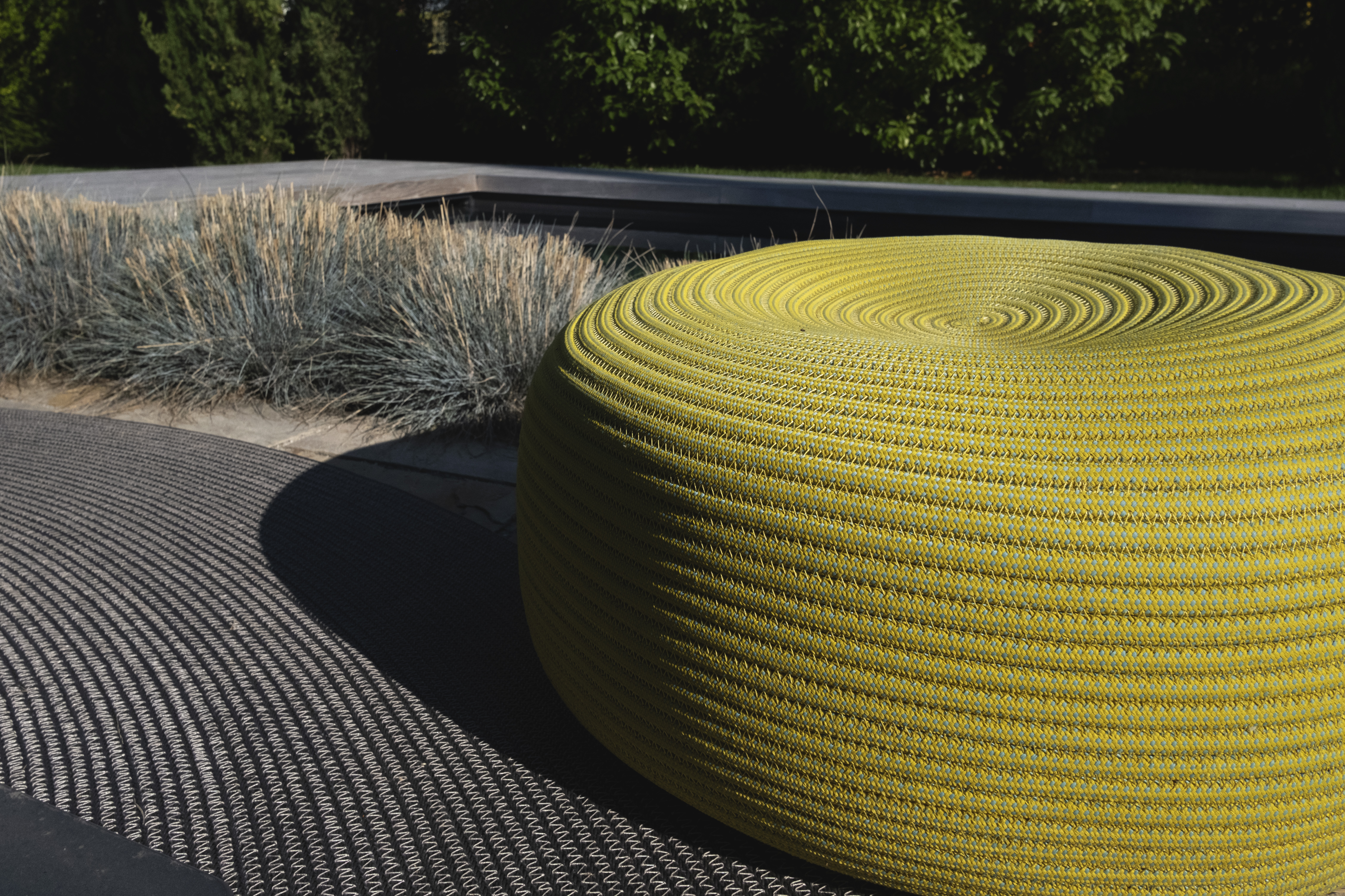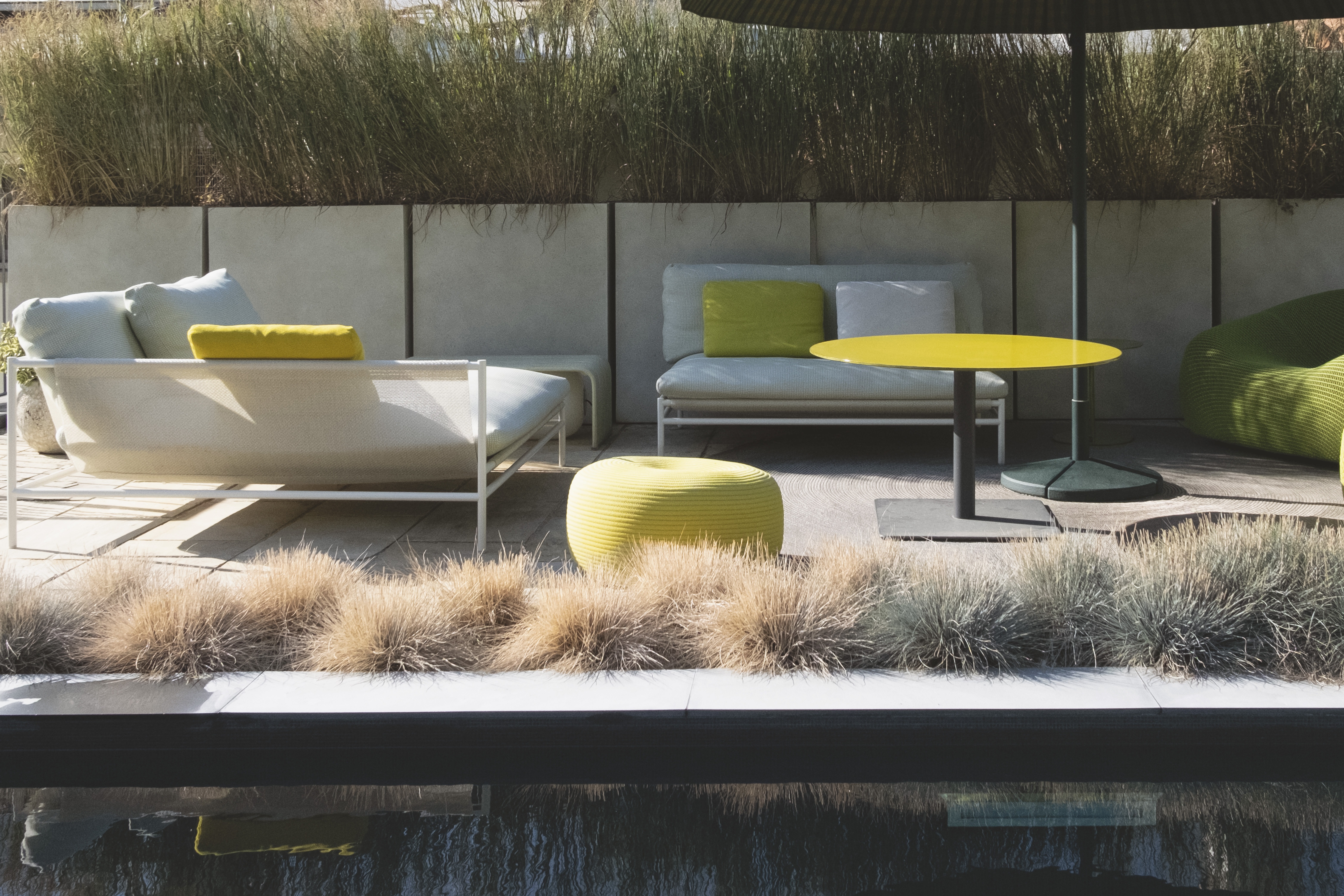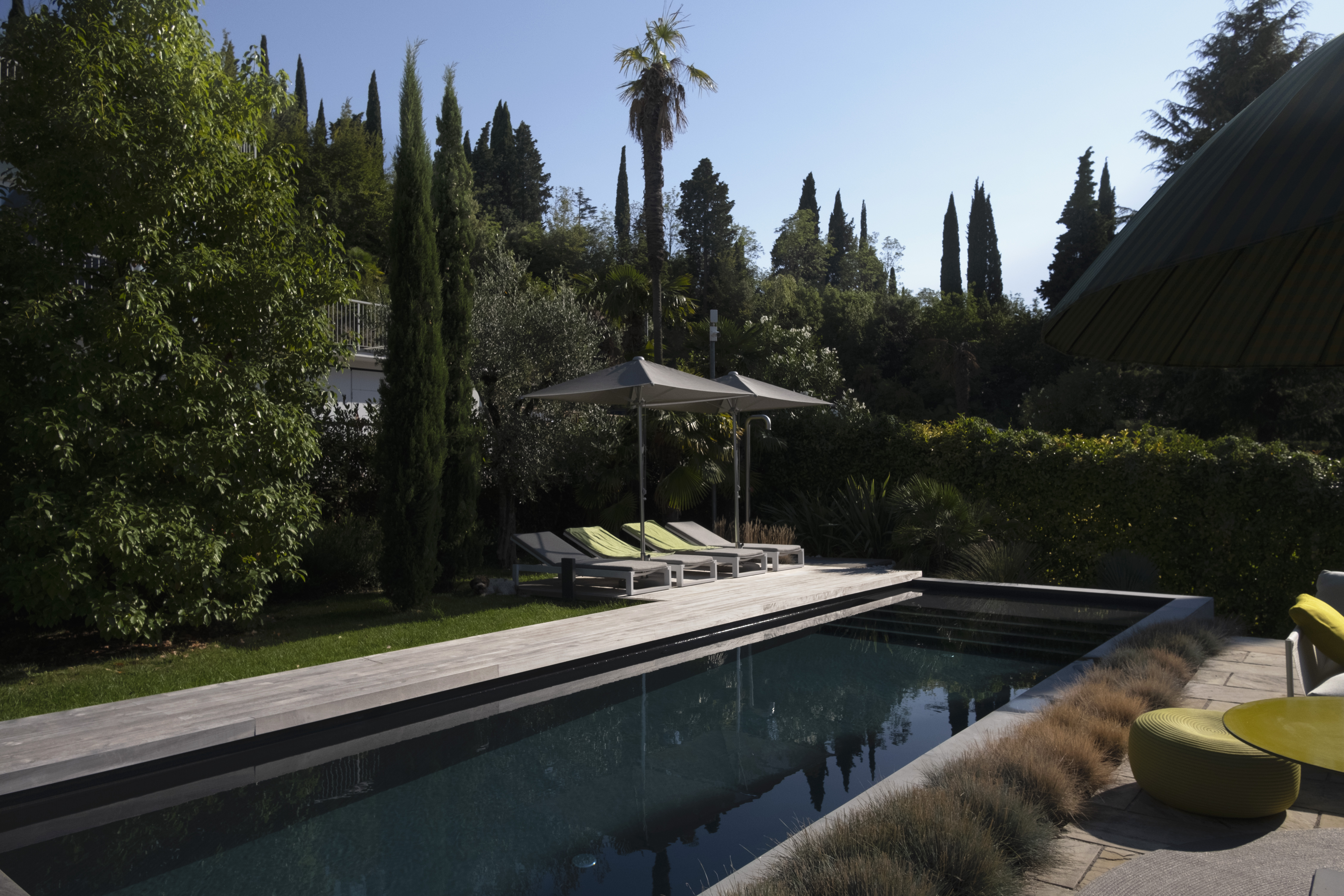 La piscina muraria con mosaico micro nero offre un'elegante raffinatezza, mentre il cemento Gypsum esterno conferisce modernità e resistenza. Il camminatoio in legno Teak naturale aggiunge calore e connessione con la natura circostante. Gli arredi Paola Lenti, parte di una collezione da esterno, sono selezionati con cura per un'estetica accattivante. La palette cromatica, con tonalità leggere ed accese, manifesta attenzione al paesaggio, creando un equilibrio armonioso tra gli elementi.